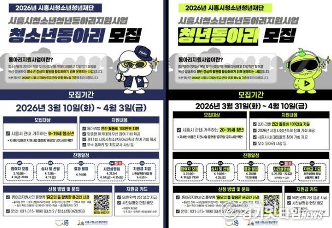 [경기핫타임뉴스=김삼영 기자] 시흥시와 시흥시청소년청년재단은 지역 청소년과 청년의 자율적인 동아리 활동을 지원하고 건강한 문화 형성을 위해 ‘2026년 시흥시 청소년ㆍ청년 동아리 지원사업’에 참여할 동아리 670개를 모집한다고 밝혔다.