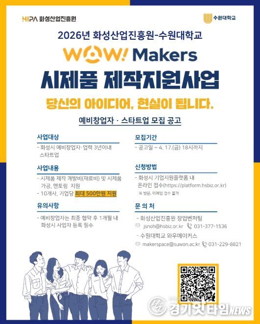 [경기핫타임뉴스=김삼영 기자] 화성산업진흥원(원장 전병선)과 수원대학교(총장 임경숙)가 협력하여 화성시 창업기업의 아이디어를 실물로 구현하는 ‘2026년 WoW! makers 시제품 제작 지원사업’을 추진한다.