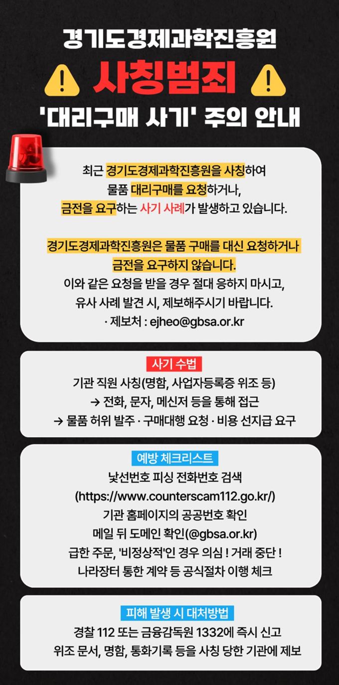 [경기핫타임뉴스=김삼영 기자] 경기도경제과학진흥원(이하 경과원)은 최근 기관 직원을 사칭한 대리구매 사기 피해 사례가 확인됨에 따라 기업을 대상으로 예방 안내를 강화하고 각별한 주의를 당부했다.