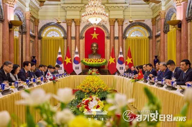 [경기핫타임뉴스=김삼영 기자] 베트남을 국빈 방문 중인 이재명 대통령은 22일(현지시간) 오후 베트남 국가주석궁에서 또 럼 당서기장 겸 국가주석과 정상회담을 갖고, 양국 간 포괄적 전략 동반자 관계 발전 방안과 지역·국제 정세 등에 대해 심도 있게 논의했다고 이규연 청와대 홍보소통수석이 서면 브리핑했다.
