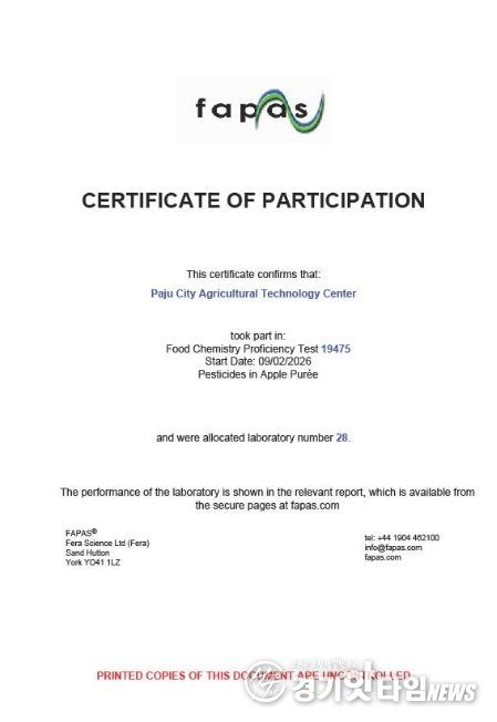 영국 환경식품농림부 식품환경연구청(페라·FERA)이 주관하는 ‘국제분석능력평가’(파파스·FAPAS)는 전 세계 공인 분석기관들이 동일한 시료를 분석해 그 정확도를 상호 비교하는 권위 있는 평가 프로그램이다. 전 세계 60개 기관이 참여한 올해 평가(파파스 19475) 결과, 파주시 농산물 안전분석실은 사과 과립즙(퓨레) 시료에 대해 10개 잔류농약 성분을 분석해 제출한 전 항목에서 ‘만족’판정을 획득했다.