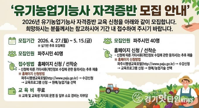 [경기핫타임뉴스=김형철 기자] 파주시농업기술센터는 친환경농업 분야 농업 전문 인력 육성을 위한 '2026년 유기농업기능사 자격증 취득’교육생을 4월 27일부터 5월 15일까지 모집한다.
