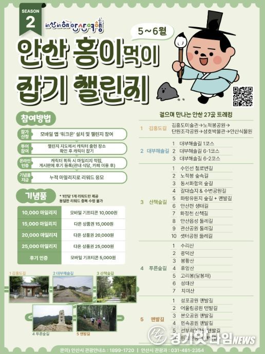 이번 2회차는 ‘걸으며 만나는 안산’을 주제로 진행된다. 대부도와 시내 주요 산책로, 숲길, 공원 맨발길 등 총 27곳에서 캐릭터를 찾는 방식으로 운영되며, 1회차 참여자도 다시 참여할 수 있다.