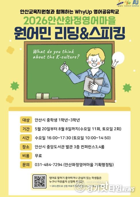 이번 프로그램은 ‘안산 동그리 공유학교’를 기반으로 운영되는 WhyUp 영어공유학교 사업의 일환으로 추진된다. 참가 신청은 27일 오전 9시부터 오는 30일 오후 6시까지 경기공유학교 누리집에서 온라인으로 하면 된다.