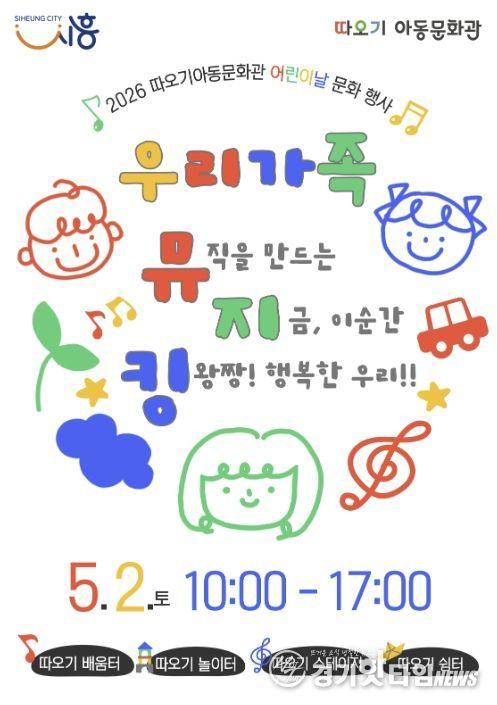 [경기핫타임뉴스=김삼영 기자] 시흥시 따오기아동문화관은 어린이날을 맞아 오는 5월 2일 오전 10시부터 오후 5시까지 따오기아동문화관 야외 일대에서 2026년 어린이날 문화행사 ‘우리가족 뮤지킹’을 개최한다.