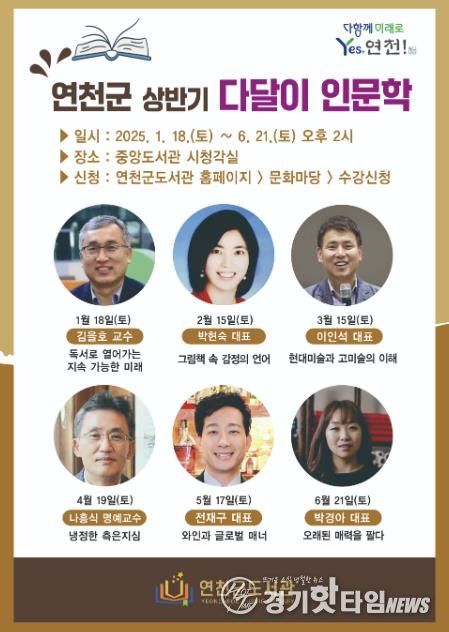 [경기핫타임뉴스=김형철 기자] 연천군은 1월부터 매월 셋째주 토요일 연천군 독서홍보대사 김을호 교수와 함께하는 ‘다달이 인문학’을 운영한다. ‘다달이 인문학’ 프로그램은 성인을 대상으로 철학, 건강, 언어, 문화, 예술, 식문화 등 다양하고 흥미로운 주제를 통해 인문학적 소양을 함양할 수 있는 기회를 제공할 것이다.