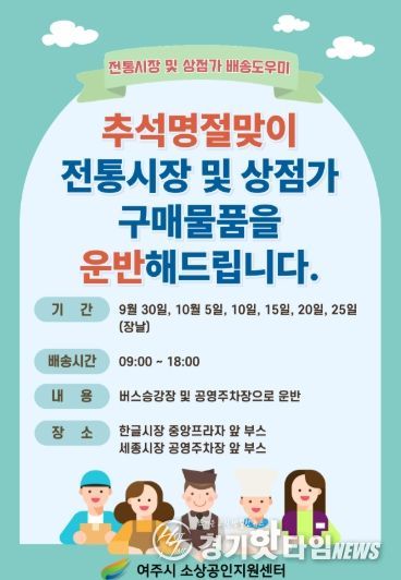 [경기핫타임뉴스=김형철 기자] 여주시는 여주시소상공인지원센터 주관으로 다가오는 추석 명절을 맞이하여 전통시장과 상점가를 찾는 시민들의 편의를 돕고 전통시장 활성화를 위해 ‘전통시장 및 상점가 배송 도우미’ 서비스를 운영한다.