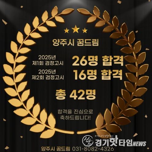 [경기핫타임뉴스=김형철 기자] 양주시 학교밖청소년지원센터 소속 청소년 42명이 지난 4월과 8월 실시된 2025년 초·중·고등학교 검정고시에 합격했다.