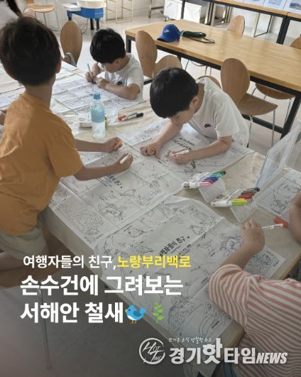 ▲‘여행자들의 친구, 노랑부리백로’는 대부도와 안산 지역의 생태·문화적 가치를 발굴하는 ’사회적협동조합 지지네이쳐’ 가 운영한다. 프로그램은 시화호와 대부도에 찾아오는 다양한 새들을 알아보고, 손수건에 그려진 새들을 관찰하며 직접 색칠하는 체험으로 구성된다. 단순한 그리기를 넘어 습지의 중요성과 생물 다양성의 가치를 이해하고, 완성된 손수건을 활용해 기후변화 대응과 탄소중립 실천의 의미를 되새기도록 기획됐다.