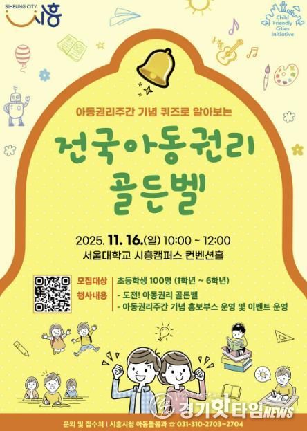 [경기핫타임뉴스=김삼영 기자] 시흥시는 오는 11월 16일 오전 10시, 서울대학교 시흥캠퍼스 컨벤션홀에서 열리는 ‘퀴즈로 알아보는 전국 아동권리 골든벨’에 참가할 초등학생을 10월 31일까지 모집한다.