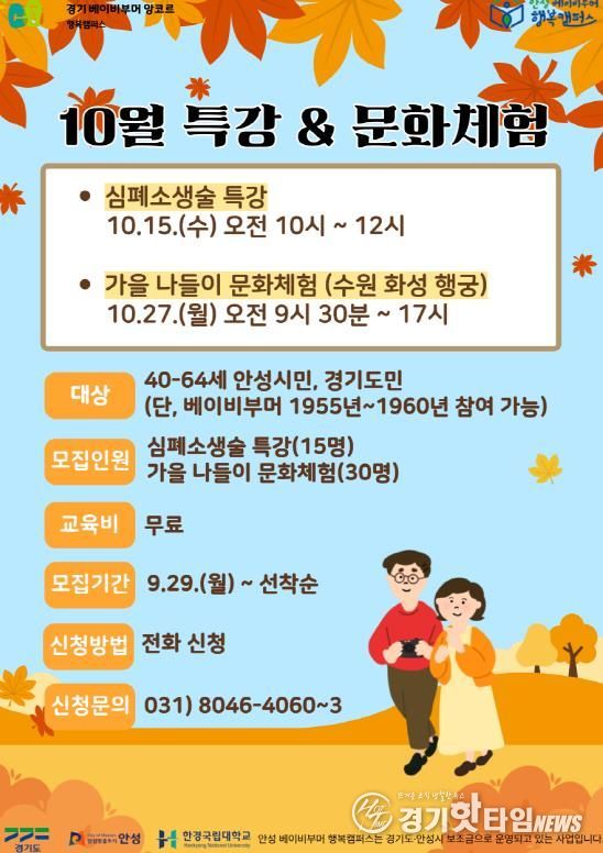 [경기핫타임뉴스=김삼영 기자] 안성 베이비부머 행복캠퍼스(한경국립대학교 평생교육원)는 오는 10월 15일부터 27일까지 중장년 안성시민(경기도민)을 대상으로 ‘10월 특강(심폐소생술) 및 문화체험(수원화성행궁)’ 프로그램을 운영한다고 밝혔다.