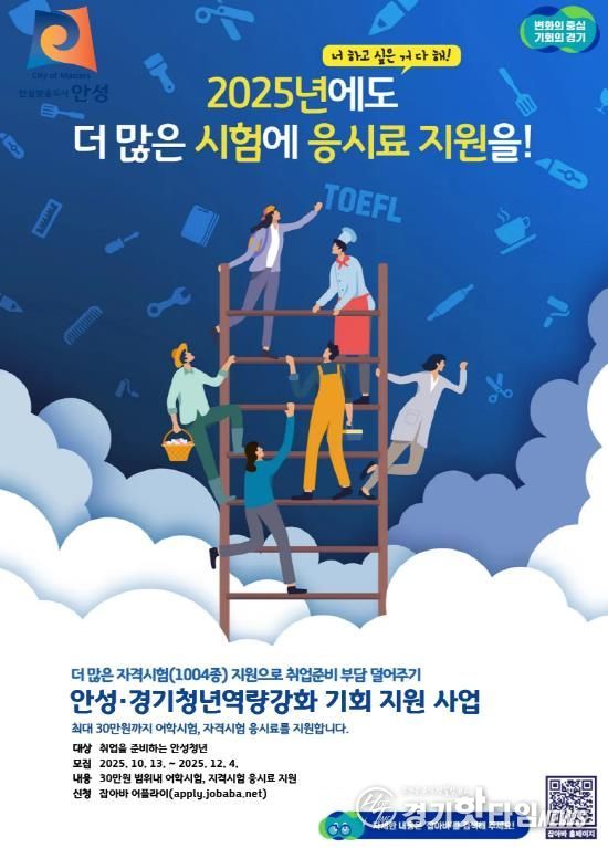 안성시 관계자는 “어학·자격시험은 취업의 문턱을 넘는 데 필수적인 과정이지만 반복 응시가 필요한 경우가 많아 비용 부담이 크다”며 “이번 추가 모집을 통해 청년들이 응시료 부담을 낮추고 실제 취업 역량을 한 단계 끌어올리는 데 도움이 되길 바란다”고 말했다.