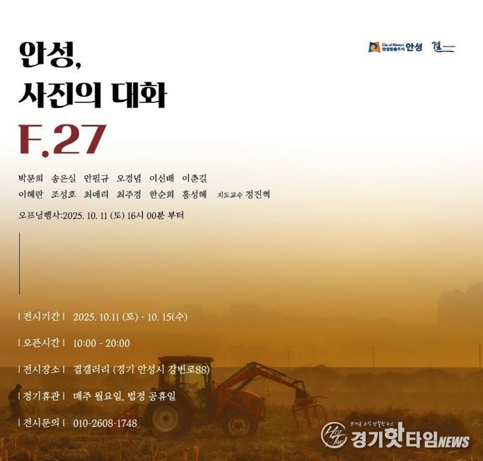 [경기핫타임뉴스=김삼영 기자] 안성시 사진동아리 F.27 photo가 오는 10월 11일부터 15일까지 안성천 작은미술관 결갤러리에서 전시회 ‘안성, 사진의 대화 F.27’을 개최한다. 이번 전시는 동아리 회원 18명이 참여해 안성의 자연환경과 사람들의 이야기를 기록한 작품을 선보인다.