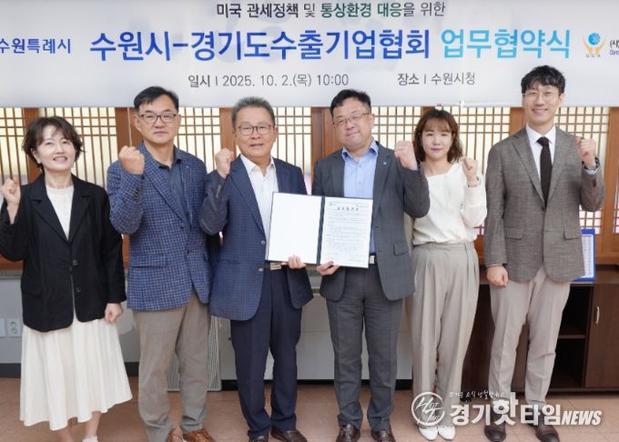 수원시는 수출지원기관 경기도수출기업협회는 2일 수원시청에서 업무협약을 체결하고, 관세 피해 기업 지원을 위해 협력하기로 했다. 협약식에는 김현수 수원시 제1부시장, 강성호 경기수출기업협회 회장 등이 참석했다.