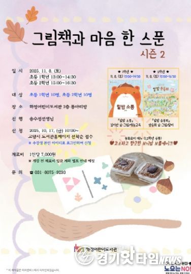 [경기핫타임뉴스=김형철 기자] 고양특례시 화정어린이도서관은 오는 11월 8일 ‘고소하고 향긋한 보늬밤 보틀케이크’를 만들어보는 그림책 동화요리 프로그램‘그림책과 마음 한 스푼-시즌2’를 운영한다.