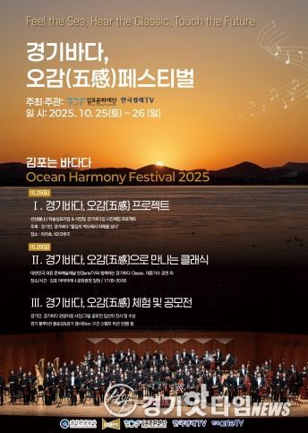 [경기핫타임뉴스=김형철 기자] (재)김포문화재단은 오는 10월 25일부터 26일까지 양일간 김포 아라마리나 문화광장에서 'Ocean Harmony Festival 2025, 경기바다 오감(五感) 페스티벌'을 개최한다고 밝혔다. 이번 행사는 한국경제TV 및 한경arteTV가 주관하고 경기관광공사가 후원한다.