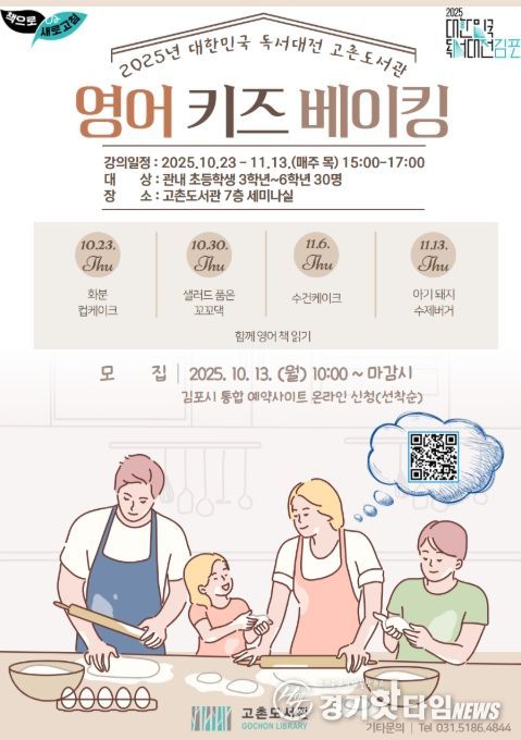 [경기핫타임뉴스=김형철 기자] 김포시 고촌도서관은 2025년 대한민국 독서대전 개최를 기념해 ‘영어 키즈 베이킹’ 프로그램을 10월 23일부터 11월 13일까지 매주 목요일 오후 3시부터 5시까지 진행한다.