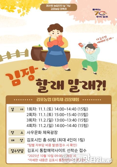 [경기핫타임뉴스=김형철 기자] 김포시는 '제31회 농업인의 날 기념' 김포농업 대축제를 맞아 오는 11월 1일부터 11월 2일까지 시민참여 김장체험 행사를 개최한다.