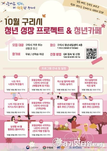 [경기핫타임뉴스=김형철 기자] 구리시는 고용노동부 공모사업에 선정돼 4월부터 추진 중인‘2025년 구리시 청년 성장프로젝트’의 10월 프로그램 참여자를 10월 30일 오후 1시까지 모집한다고 밝혔다.