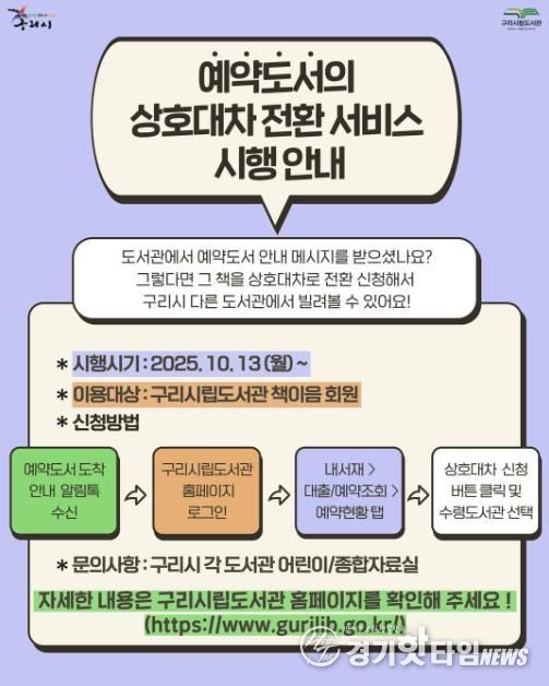 [경기핫타임뉴스=김형철 기자] 구리시는 오는 10월 13일부터 시민들의 도서 이용 편의성을 높이기 위해‘시립도서관 예약 도서 상호대차 전환 서비스’를 새롭게 운영한다고 밝혔다.