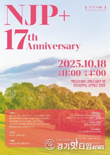 [경기핫타임뉴스=김삼영 기자] 경기문화재단 백남준아트센터(NJP, 관장 박남희)는 2025년 10월 18일, 개관 17주년 기념 축제 'NJP+'를 연다. 특히 이번 행사는 백남준아트센터와 경기도박물관, 경기도어린이박물관으로 이어지는 산책로 환경개선과 맞물려 축하의 의미를 더하고 있다. 아트센터는 올해 시민 예술 교육프로그램인 ‘퍼블릭 아카데미’ 운영, 지역 연계 협력 축제인 ‘제8회 머내마을영화제’ 공동체 상영관 참여, 유휴부지에 공유 정원을 조성하는 ‘이키로(2km) 정원행동 캠페인’ 등 지역과 환경을 잇는 새로운 고객서비스 프로그램을 기획·추진하고 있다.