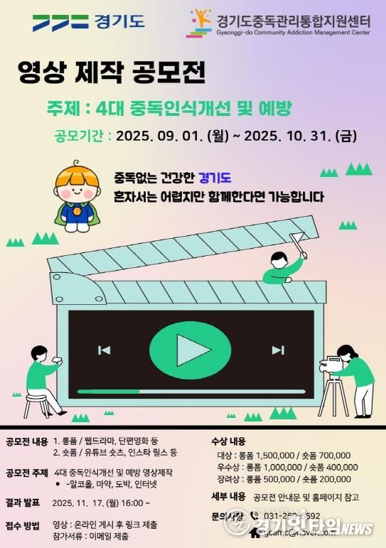 [경기핫타임뉴스=김삼영 기자] 경기도와 경기도중독관리통합지원센터가 ‘2025년 중독예방 영상 공모전’을 개최한다. 이번 공모전은 전 도민을 대상으로 알코올, 마약, 도박, 인터넷 4대 중독에 대한 위험성과 경각심을 높이고 예방 문화를 확산하기 위해 마련됐다.
