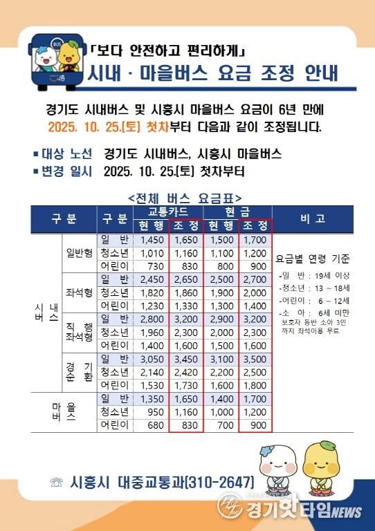 [경기핫타임뉴스=김삼영 기자] 시흥시는 오는 10월 25일 첫차부터 경기도 시내버스 및 시흥시 마을버스 요금을 조정한다.