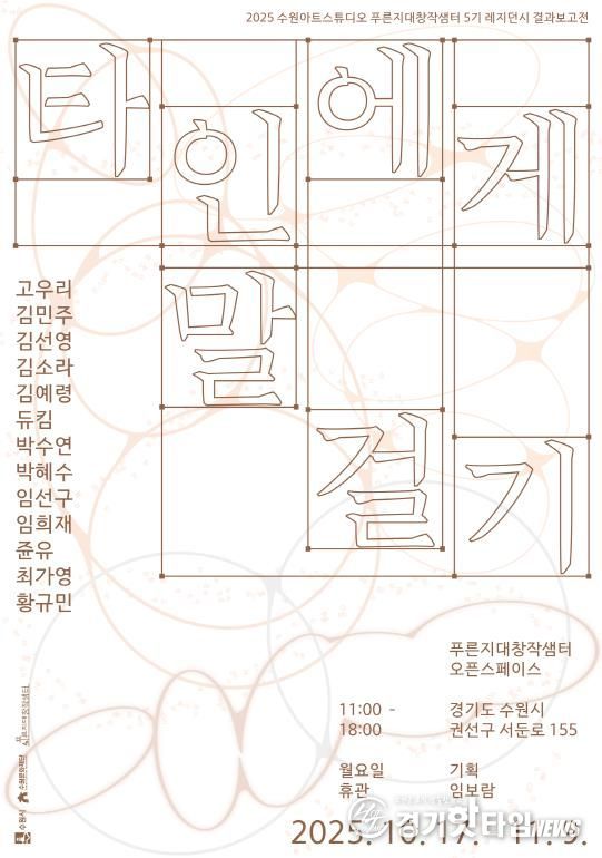 [경기핫타임뉴스=김삼영 기자] 수원문화재단은 오는 10월 17일부터 11월 9일까지 약 3주간 탑동 시민농장에 자리한 수원아트스튜디오 푸른지대창작샘터에서 5기 레지던시 참여작가 13인의 올 한 해 작품 활동 성과를 공유하는 결과보고전 '타인에게 말 걸기'를 개최한다.