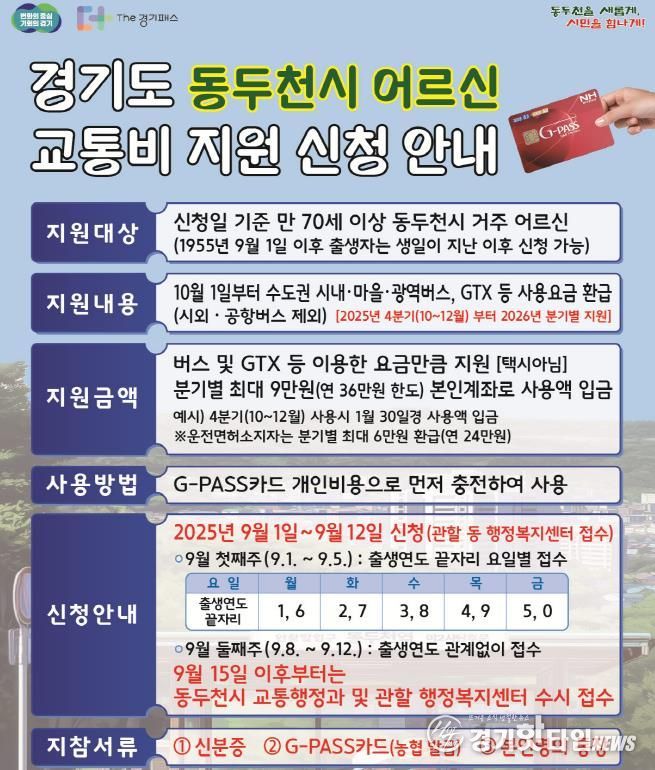 [경기핫타임뉴스=김형철 기자] 동두천시는 만 70세 이상 어르신의 대중교통비 부담을 덜기 위해 ‘어르신 교통비 지원사업’을 적극 추진하고 있다고 10일 밝혔다.