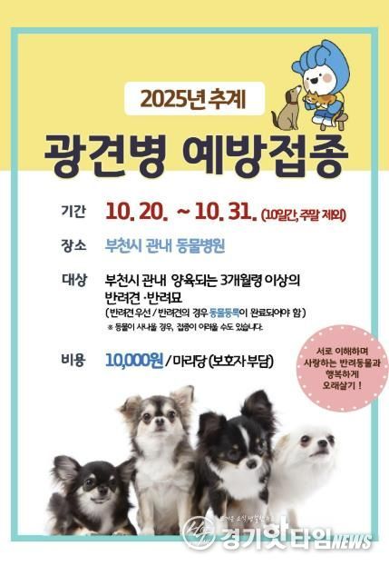 [경기핫타임뉴스=김형철 기자] 부천시는 10월 20일부터 31일까지 토요일과 일요일을 제외한 평일에 관내 동물병원 71곳에서 ‘추계 광견병 예방접종’을 실시한다.