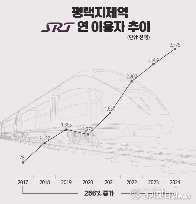 평택지제역은 2016년 개통 당시부터 SRT가 정차한 역사로, 매년 이용객 수가 꾸준히 증가하고 있다. 실제 ‘철도연감’에 따르면 평택지제역의 연간 SRT 승하차 인원은 2017년 78만 1천 명이었지만, 2024년에는 277만 8천 명으로 256%의 증가율을 기록했다. 이러한 증가율은 SRT 역사 중 가장 높은 수치다.
