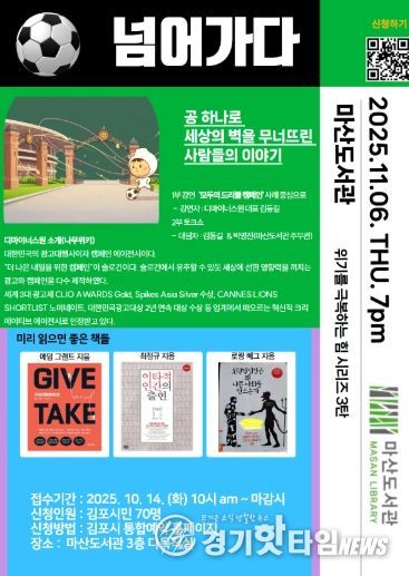 [경기핫타임뉴스=김형철 기자] 마산도서관은 오는 11월 6일 19시, 본관 3층 다목적실에서 ‘공 하나로 세상의 벽을 무너뜨린 사람들의 이야기’ 프로그램을 운영한다고 밝혔다.