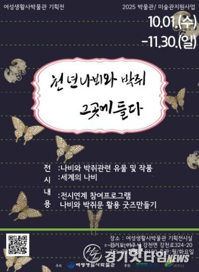 [경기핫타임뉴스=김형철 기자] 여주시에서 진행하는 2025년 박물관·미술관 지원사업의 일환으로 여성생활사박물관의 ‘천년 나비와 박쥐 그곳에 들다’ 전시가 10월 1일부터 11월 30일까지 개최된다.