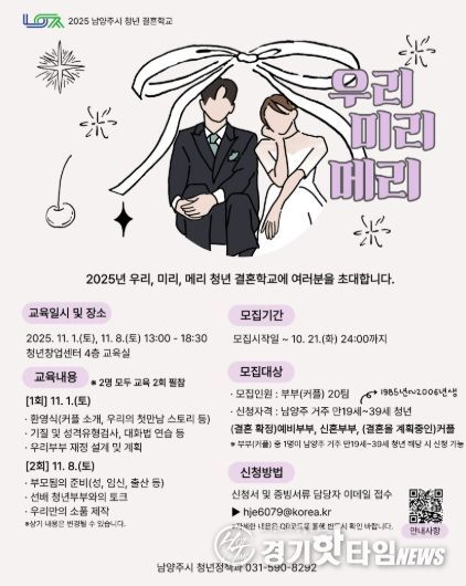모집 대상은 결혼 확정 예비부부, 최근 6개월 이내 결혼한 신혼부부, 결혼을 계획 중인 청년 20팀이다. 참여자 2인 중 1명이 남양주에 거주하는 만 19세부터 39세의 청년이면 신청이 가능하며, 2명 모두 교육 2회에 참석해야 한다.
