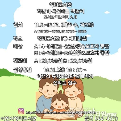[경기핫타임뉴스=김형철 기자] 이천시 청미도서관은 오는 11월 5일부터 12월 17일까지, 유아와 보호자를 대상으로 ‘하반기 북스타트 책놀이’ 프로그램을 운영한다.