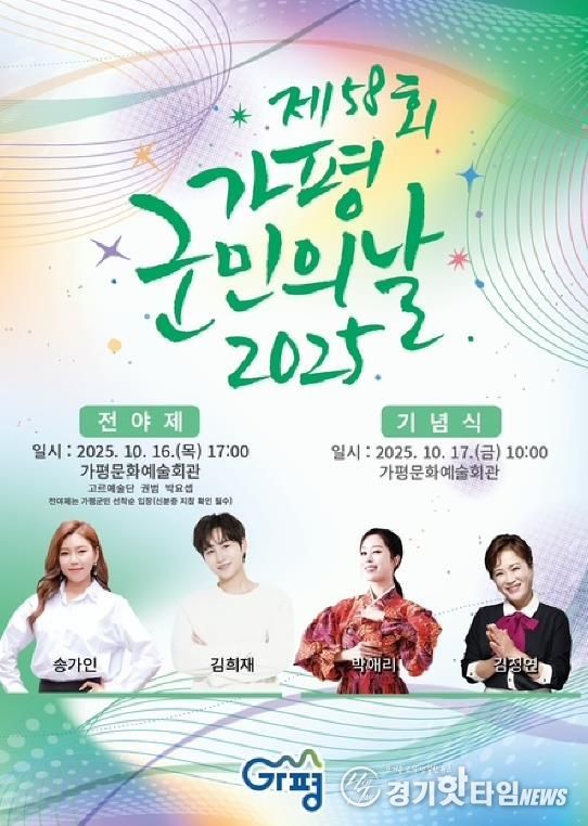 [경기핫타임뉴스=김형철 기자] 가평군은 오는 16일 오후 5시, 새롭게 리모델링을 마친 가평문화예술회관에서 ‘제58회 가평군민의 날 전야제’를 개최한다. 이번 행사는 ‘다시, 가평으로’를 슬로건으로 내세워 수해 극복과 지역 재도약을 기원하며 군민 화합의 의미를 담아 열린다.