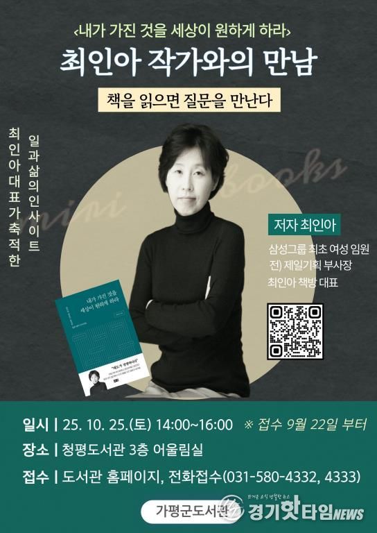 [경기핫타임뉴스=김형철 기자] 가평군은 이달 25일 오후 2시 청평도서관에서 ‘2025년 정기 작가와의 만남’ 강연을 개최한다. 이번 강연은 ‘최인아 책방’ 대표로 잘 알려진 최인아 작가를 초청해 ‘책을 읽으면 질문을 만난다’를 주제로 열린다.