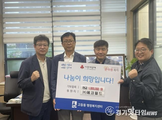 [경기핫타임뉴스=김삼영 기자] 수원시 팔달구 고등동은 10월 13일, 사회적기업 ㈜에코월드로부터 관내 취약계층을 위한 이웃돕기 성금 100만원을 전달받았다고 밝혔다.