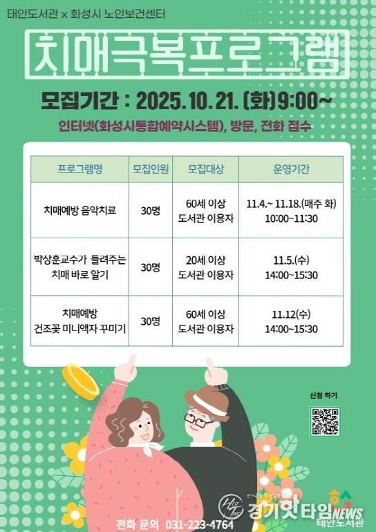 [경기핫타임뉴스=김삼영 기자] 화성시문화관광재단 운영 화성시립태안도서관은 10월 14일부터 11월 18일까지 지역 어르신의 건강한 노년을 지원하기 위한 ‘치매극복 프로그램’을 운영한다.