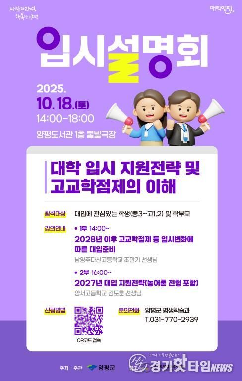 [경기핫타임뉴스=김형철 기자] 양평군은 오는 10월 18일 오후 2시, 양평도서관 물빛극장에서 관내 학생과 학부모를 대상으로 ‘2025년 양평군 대학 입시설명회’를 개최한다고 밝혔다. 이번 설명회는 대학 입시에 관심 있는 학생과 학부모에게 다양한 입시 정보를 제공하기 위해 마련됐다.