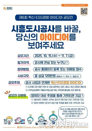 [경기핫타임뉴스=김삼영 기자] 시흥도시공사는 10월 15일부터 11월 7일까지 ‘제6회 시흥도시공사 혁신·ESG경영 아이디어 공모전’을 개최한다.