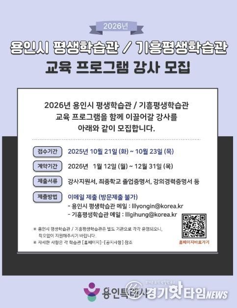 [경기핫타임뉴스=김삼영 기자] 용인특례시는 21일부터 23일까지 3일간 ‘2026년 평생학습관 프로그램’을 운영할 강사를 모집한다고 15일 밝혔다.