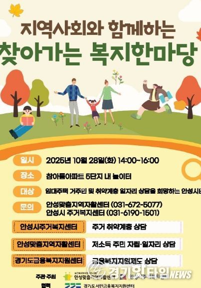 [경기핫타임뉴스=김삼영 기자] 안성시는 오는 10월 28일 오후 2시부터 4시까지 참아름아파트 5단지 내에서 ‘지역사회와 함께하는 찾아가는 복지 한마당’을 열고, 시민들을 대상으로 찾아가는 주거복지 이동상담소를 운영한다.