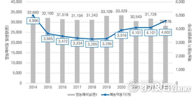 2023년 기준 경기도 영농폐기물 발생량은 영농 폐비닐이 약 3만 톤(93%), 폐농약 용기가 약 460만 개(94%)로 나타났다.