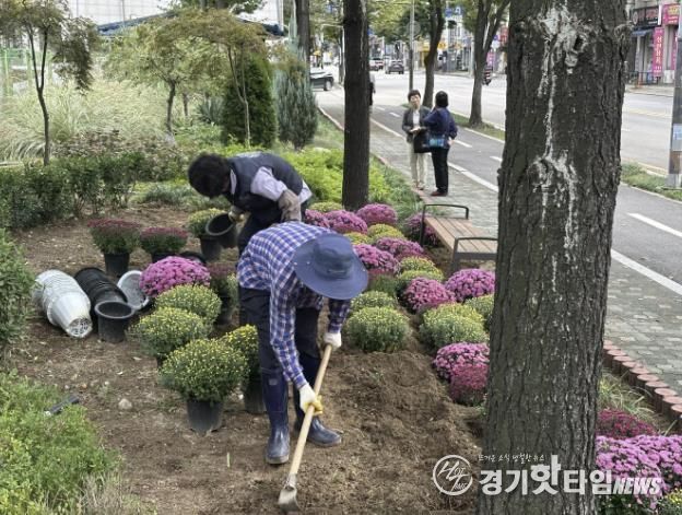 이날 활동에는 정왕본동 직원 및 기간제 근로자들이 참여해 국화 187송이를 심고 쓰레기를 수거하며 행정복지센터 일대를 정돈했다.