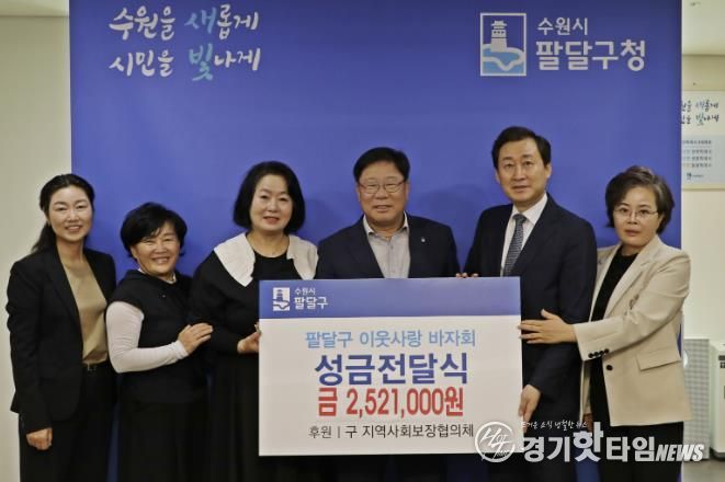 [경기핫타임뉴스=김삼영 기자] 수원시 팔달구와 구 지역사회보장협의체는 지난 15일 구청장실에서 ‘팔달구 이웃사랑 바자회’ 성금 전달식을 가졌다.