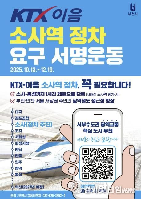 조용익 부천시장은 “KTX-이음 소사역 정차는 단순한 교통 개선을 넘어, 서해선 시대에 부천이 수도권 서남부의 중심으로 도약할 수 있는 계기”라며 “시민의 서명 하나하나가 소중한 힘이 되는 만큼 많은 참여를 바란다”고 말했다.