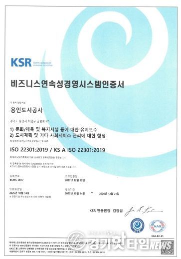 [경기핫타임뉴스=김삼영 기자] 용인도시공사는 지난 9월 29일부터 30일까지 진행된 ISO45001(안전보건경영시스템) 갱신심사 및 ISO22301(비즈니스연속성경영시스템) 사후관리심사에서 모두 ‘적합’ 판정을 받으며, 국제표준에 부합하는 안전관리체계를 지속적으로 유지하고 있음을 다시 한번 입증했다.