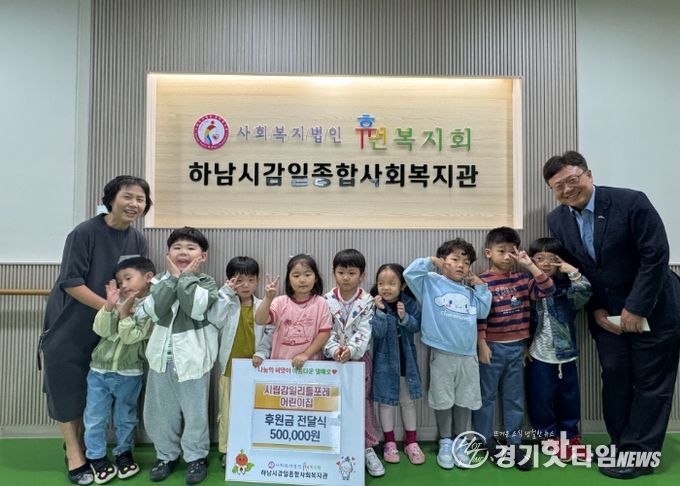 [경기핫타임뉴스=김형철 기자] 시립감일리틀포레어린이집은 지난 10월 14일 하남시감일종합사회복지관(사회복지법인 휴먼복지회 운영)에 후원금을 전달했다.