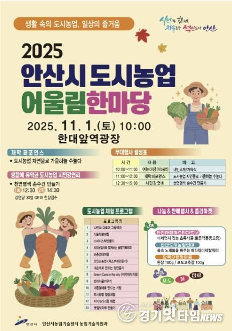 [경기핫타임뉴스=김삼영 기자] 안산시는 11월 1일 한대앞역 광장 일원에서 ‘안산시 도시농업 어울림한마당’을 개최한다고 21일 밝혔다.